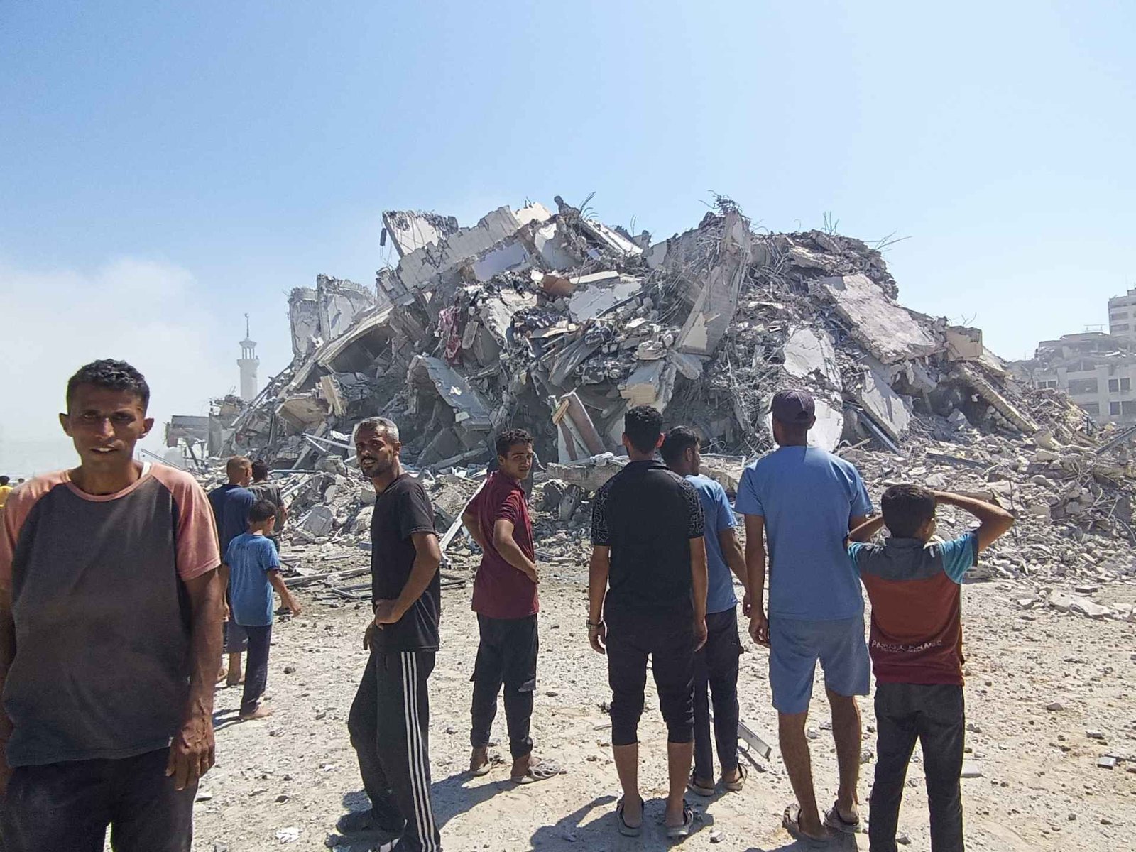 يقول أبو جمعة، في حديث للجزيرة نت، إن طائرات الاحتلال قصفت البرج بعد ما يقارب 20 دقيقة بدفعة من الصواريخ وبقي المبنى واقفا، لكن بعد عدة دقائق أعادت دكه بصواريخ أحدثت انفجارات ضخمة هزت مدينة غزة، ووصل صداها لمحافظات أخرى من القطاع، وأدت لتحويل المبنى الأعلى ارتفاعا في غزة إلى كومة ركام، دُفن تحتها جميع ممتلكات النازحين فيه.