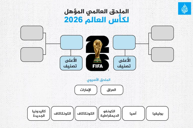 وتقام مباريات الملحق العالمي في أميركا الشمالية والأقرب بالمكسيك في مارس/آذار المقبل، ولم تحدد المواعيد والملاعب بعد.