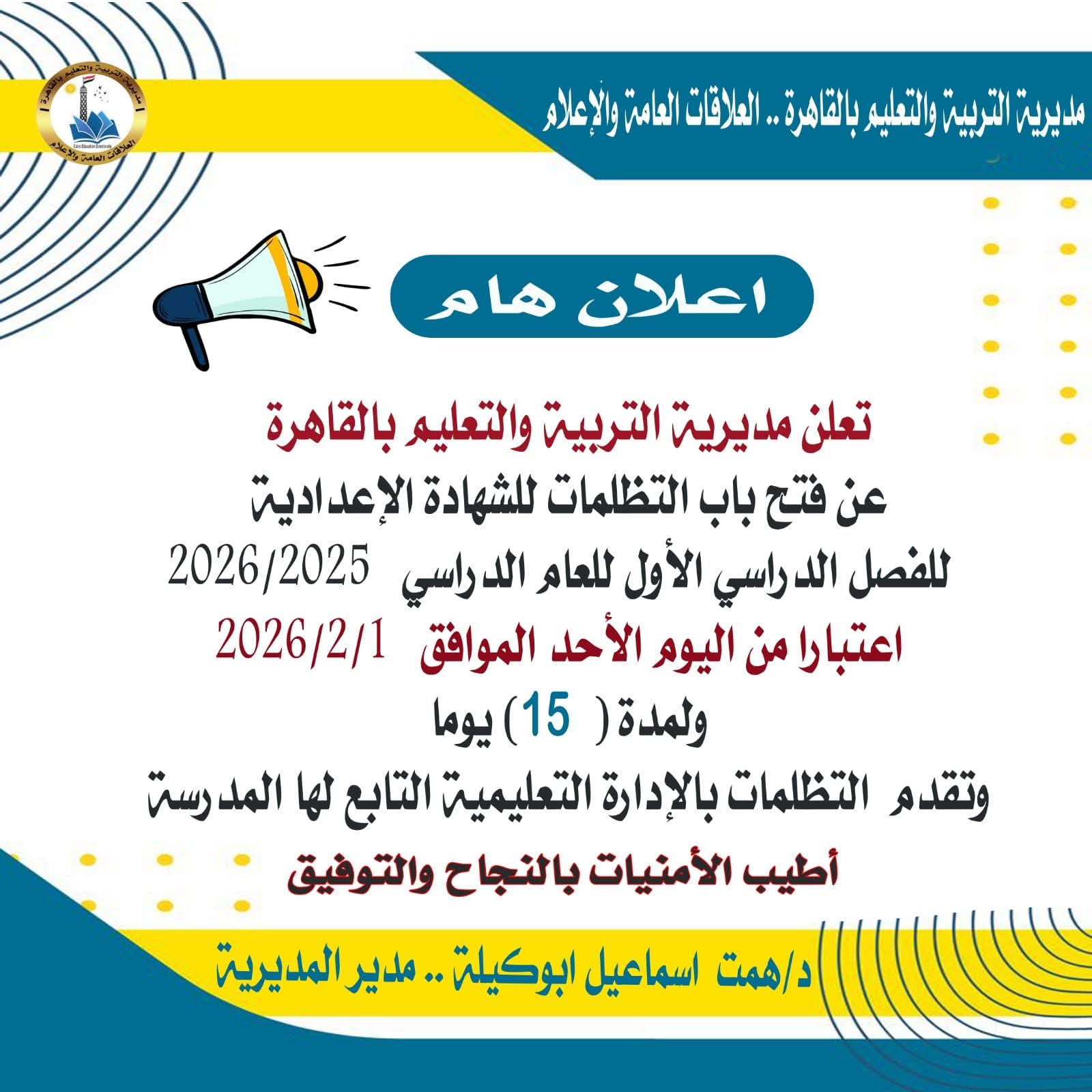 كما أعلنت مديرية التعليم بالقاهرة، فتح باب التظلمات للشهادة الإعدادية للفصل الدراسي الأول لعام 2025-2026، لجميع طلاب المرحلة الإعدادية، ويستمر تقديم التظلمات لمدة أسبوعين اعتبارًا من تاريخ الإعلان.