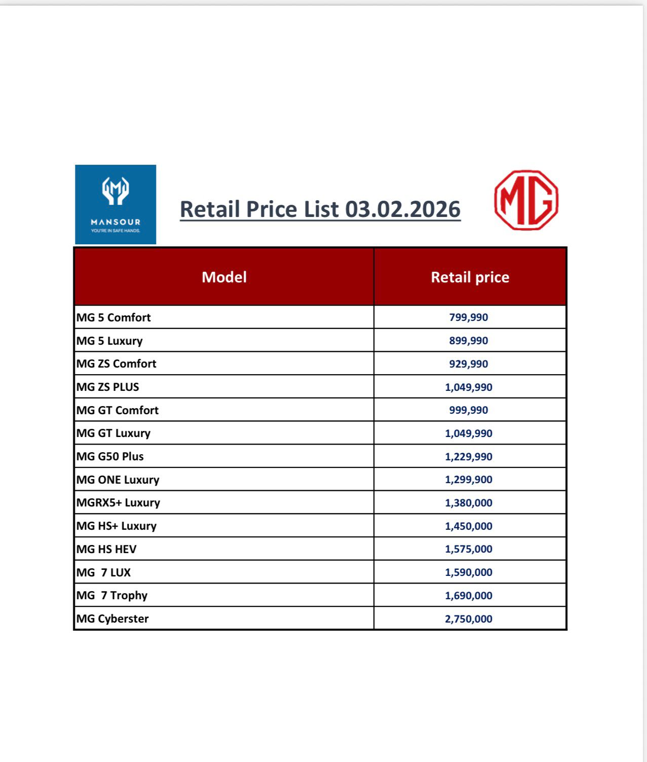 | MG Cyberster | 2 مليون و750 ألف جنيه |