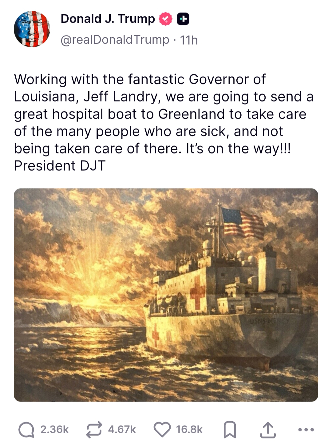 وكان ترامب أعلن، السبت، عبر منصته تروث سوشال، أنه سيعمل على إرسال “سفينة مستشفى رائعة إلى جرينلاند” لتقديم الرعاية لعدد من المرضى الذين لا يتلقون خدمات صحية هناك، مؤكدًا أن السفينة في طريقها.