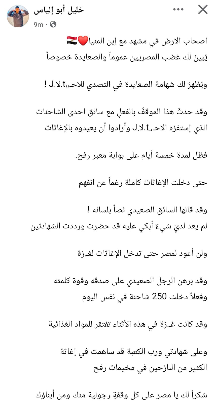 وكتب عبر حسابه الشخصي على فيسبوك: “يظهر لك شهامة الصعايدة في التصدي للاحتلال، ويبين غضب المصريين من أجلنا”، مؤكدًا حجم التضامن الشعبي الذي يجمع الشعبين في محنتهم المشتركة.