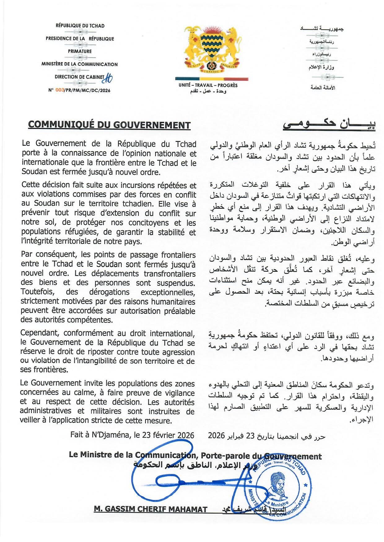 اتخذت الحكومة التشادية قرارًا بإغلاق حدودها مع السودان إلى أجل غير مسمى، في خطوة تهدف إلى منع امتداد الصراع الدائر في الدولة المجاورة إلى داخل أراضيها، وذلك بعد ما وصفته بتوغلات متكررة لمجموعات مسلحة مرتبطة بالحرب السودانية.