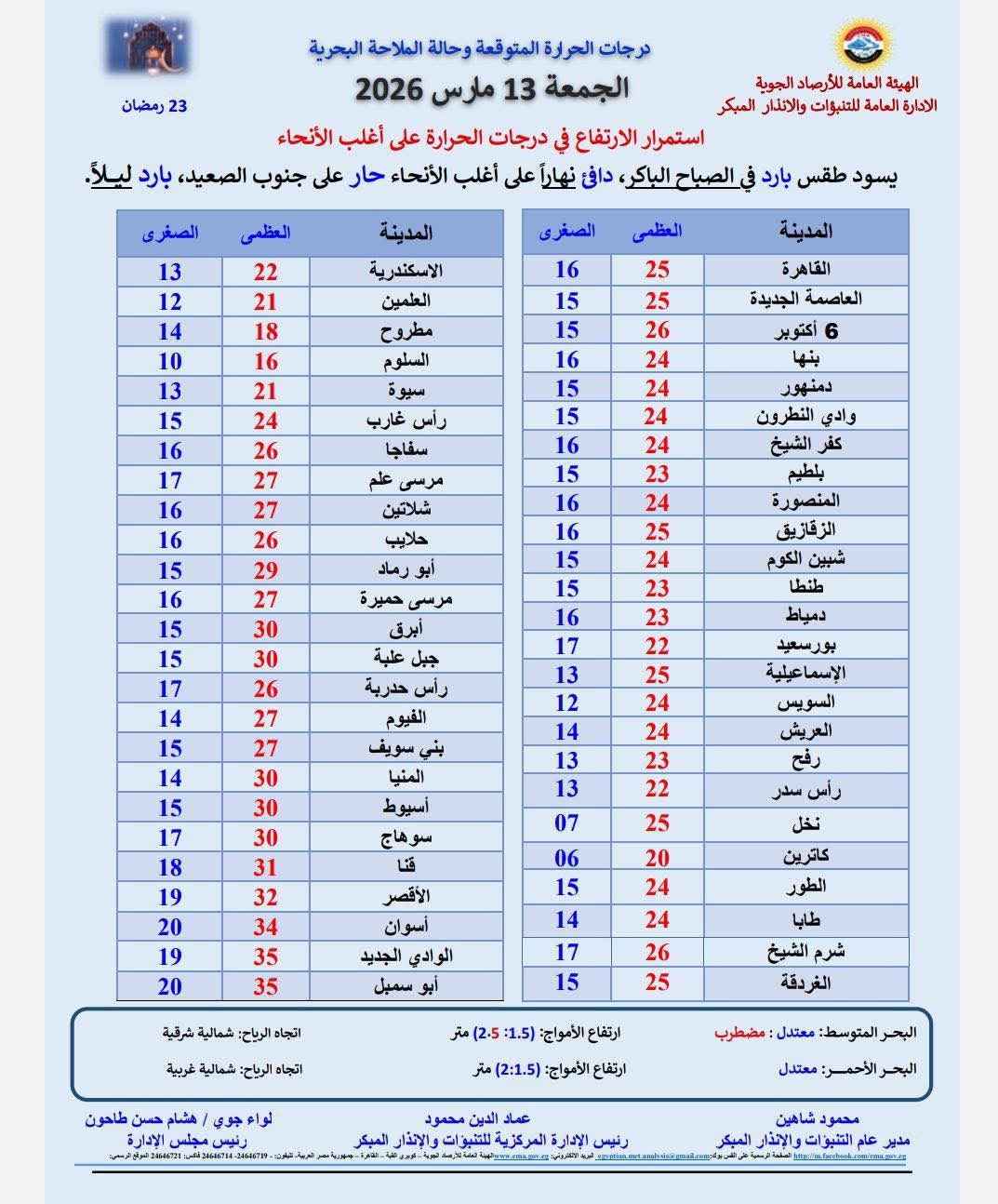 وأكدت الهيئة أن توقعات حالة الطقس اليوم الجمعة 23 رمضان 2026 في مصر تعتمد على أحدث خرائط الطقس وصور الأقمار الصناعية، مع متابعة مستمرة لأي تغيرات قد تطرأ على الأحوال الجوية خلال اليوم.