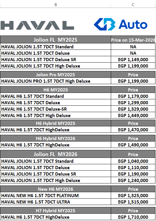 | HAVAL JOLION PRO 1.5T 7DCT High Deluxe | مليون و199 ألف جنيه |