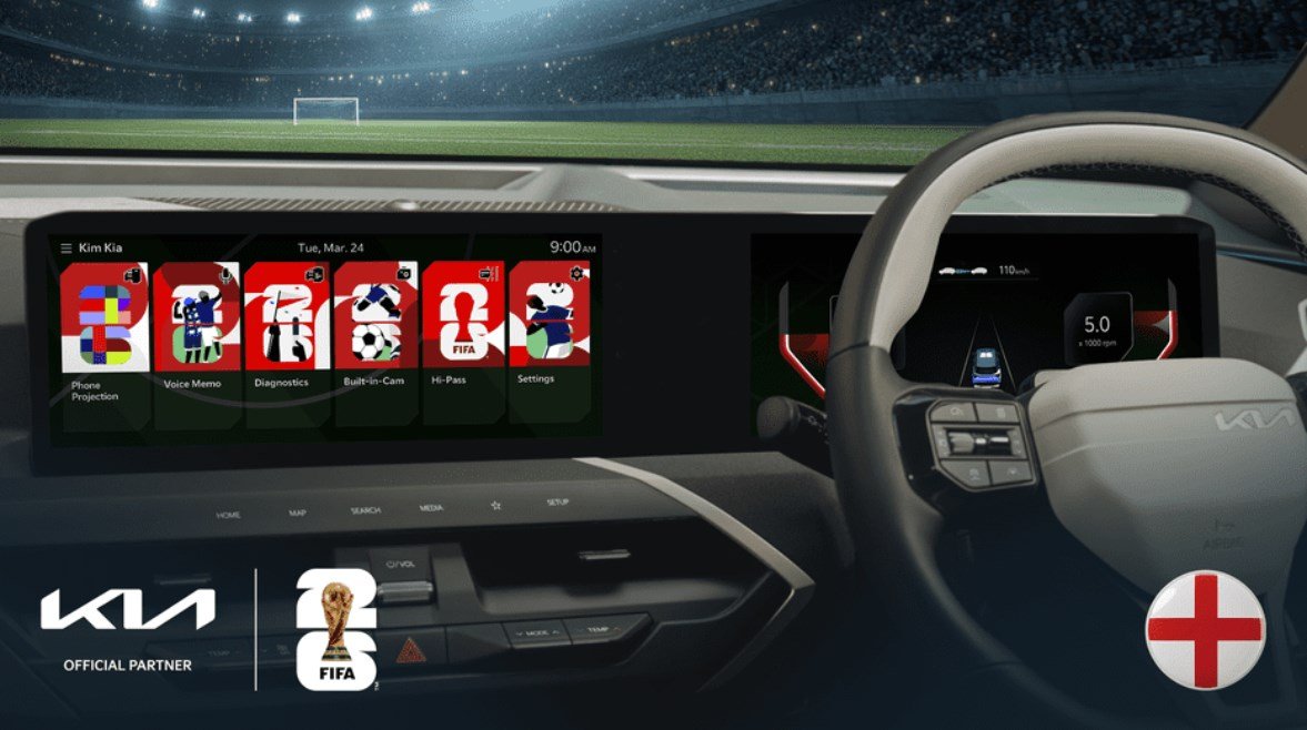 وستكون مواضيع كأس العالم لكرة القدم 2026 متاحة لسيارات كيا المجهزة بنظام المعلومات والترفيه ccNC (Connected Car Navigation Cockpit) في الولايات المتحدة وأوروبا وكوريا الجنوبية . ويمكن تنزيل هذه المواضيع واستخدامها مجاناً عبر متجر Kia Connect، وستظل متاحة حتى 31 أغسطس تزامناً مع فترة إقامة بطولة كأس العالم 2026. وفي أوروبا، ستتوفر المواضيع اعتباراً من 31 مارس 2026.