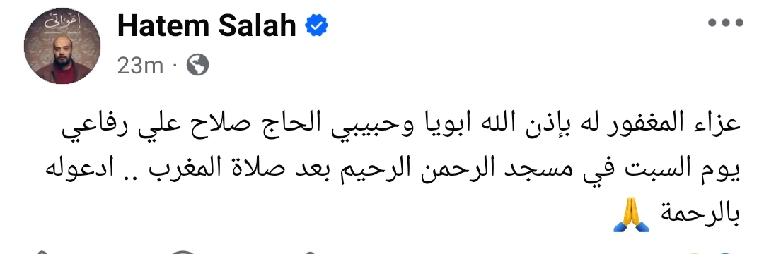 وكتب حاتم صلاح عبر صفحته على فيسبوك: “عزاء المغفور له بإذن الله والدي الحبيب الحاج صلاح علي رفاعي، يوم السبت بمسجد الرحمن الرحيم عقب صلاة المغرب.. نسألكم الدعاء له بالرحمة”.